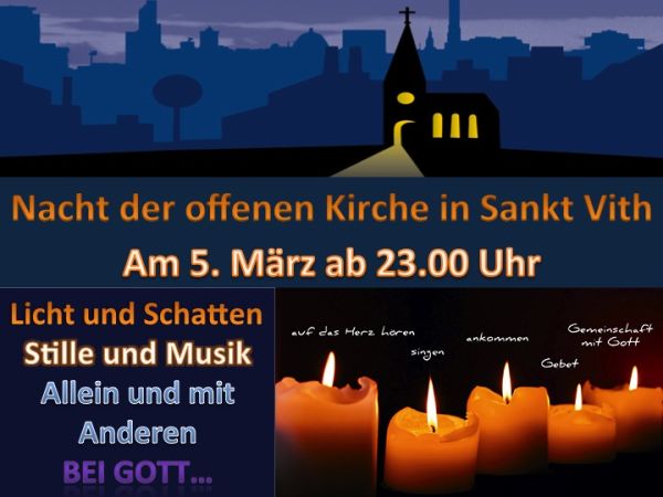 Papst Franziskus ruft in der österlichen Bußzeit für den 5. / 6. März zu einer weltweiten Initiative mit dem Titel „24 Stunden für den Herrn“ auf. Auch unser Dekanat Eifel beteiligt sich an dieser weltweiten Initiative, die Teil des Heiligen Jahres der Barmherzigkeit ist und dazu einlädt, sich bewusst Zeit für und mit Gott zu nehmen.Anliegen dieser Aktion ist, dass den Menschen der Empfang des Sakramentes der Versöhnung als Gelegenheit, um Gottes Barmherzigkeit zu erfahren, sowie die Möglichkeit zur eucharistischen Anbetung angeboten werden. Auch unser Pfarrverband nimmt an dieser Initiative in der Dekanatskirche St.Vith teil: