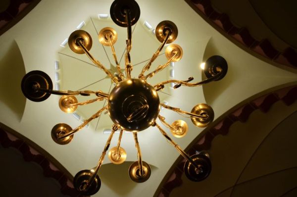 Der Kronleuchter mit 3x5 Kerzen in der Stefanus-Pfarrkirche mit Muttergottesbild im Medaillon oben im Kronleuchter wurde bei der Gründung der Rosenkranzbruderschaft 1654 gestiftet.