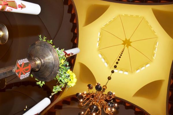 In vielen Bildsymbolen findet sich die Auferstehungsfreude wieder. Eine große knorrige Wurzel wird über und über mit Blumen geschmückt. Neben der Osterkerze und dem Baum der Täuflinge ist die sprudelnde Quelle ein wichtiger Bestandteil des Ostergartens, wie auch das große Buch, das in großen Lettern von der Auferstehung kündet und das Weizenkorn, das aus der Erde hervordringt und sich der Ostersonne entgegenstreckt. Das Füllhorn zeugt von dem übersprudelnden Leben, das aus der Auferstehung dem Glaubenden entgegenkommt. Anschaulich für die Kirchenbesucher in Szene gesetzte Figuren wie die von Maria Magdalena komplettieren das Ensemble. „Die Blumen sind Symbole des Lebens und der Lebensfreude, die Gott den Menschen mit der Osterbotschaft verkündet“, erläutert Roswitha Boemer, die für die Blumendekoration zuständig ist.