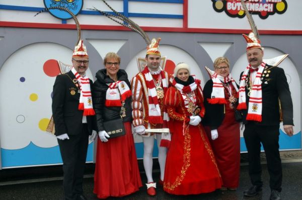 Das dritte Prinzenpaar der KKG "Rot-Weiß", Jochen I. und Sidonia I., stand zusammen mit dem neunten Kinderprinzenpaar im neuen fröhlichen Prinzenwagen der KKG Rot-Weiß, denn die alte Wagenburg war in die Jahre gekommen, begann zu schimmeln und zu rosten. In dem neuen Prunkwagen wurden auf Kunststoffplatten Bütgenbacher Motive verarbeitet, so der Steiner Hof, das Viadukt und die Burg, dazu die geschichtsträchtigen Wappen der ehemaligen Herrscher von Bütgenbach. Gottfried Brüls, Dirk Veithen, Stefan Brandenburg haben unter der Anleitung von Raymond S., dem kreativen Kopf des Teams und aus dessen Feder der Entwurf stammt, in den letzten vier Wochen bei unzähligen ehrenamtlichen Stunden eine Meisterleistung vollbracht, berichtete KKG-Vizepräsident Sven Schommer.