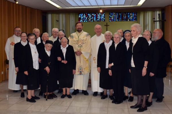 Der Abschied am Samstag brachte auch so manches Wiedersehen: Zur Feier waren viele gekommen, die sich in irgendeiner Weise mit dem Kloster verbunden fühlen, darunter auch nicht wenige Mitarbeiter(innen). Mit Karl Sarlette und Norbert Krings aus Weywertz waren sogar zwei Personen der ersten Stunde dabei, die 1948-49 beim Aufbau des zerstörten Gebäudes mitgewirkt haben. So war der Gottesdienst ein Zeichen der gegenseitigen Verbundenheit und des Dankes dafür, dass die Ordensleute und die Menschen der Region hier einander eine Stütze sein durften. In diesem Sinne wurde auch der Gottesdienst gemeinsam mit den Sänger(innen) des Bütgenbacher Kirchenchors St. Stefanus unter der Leitung von Raymond Huynen gestaltet.